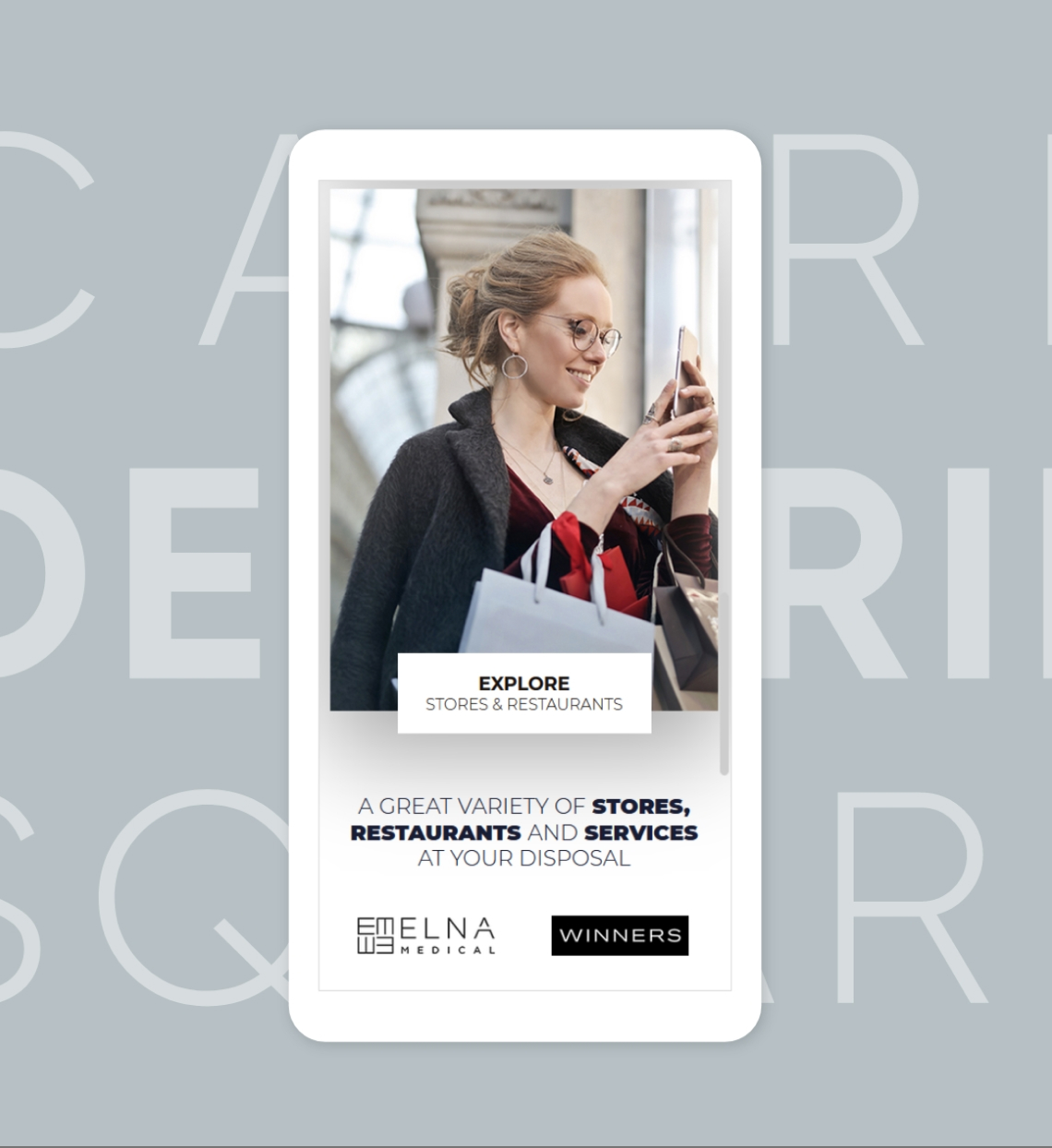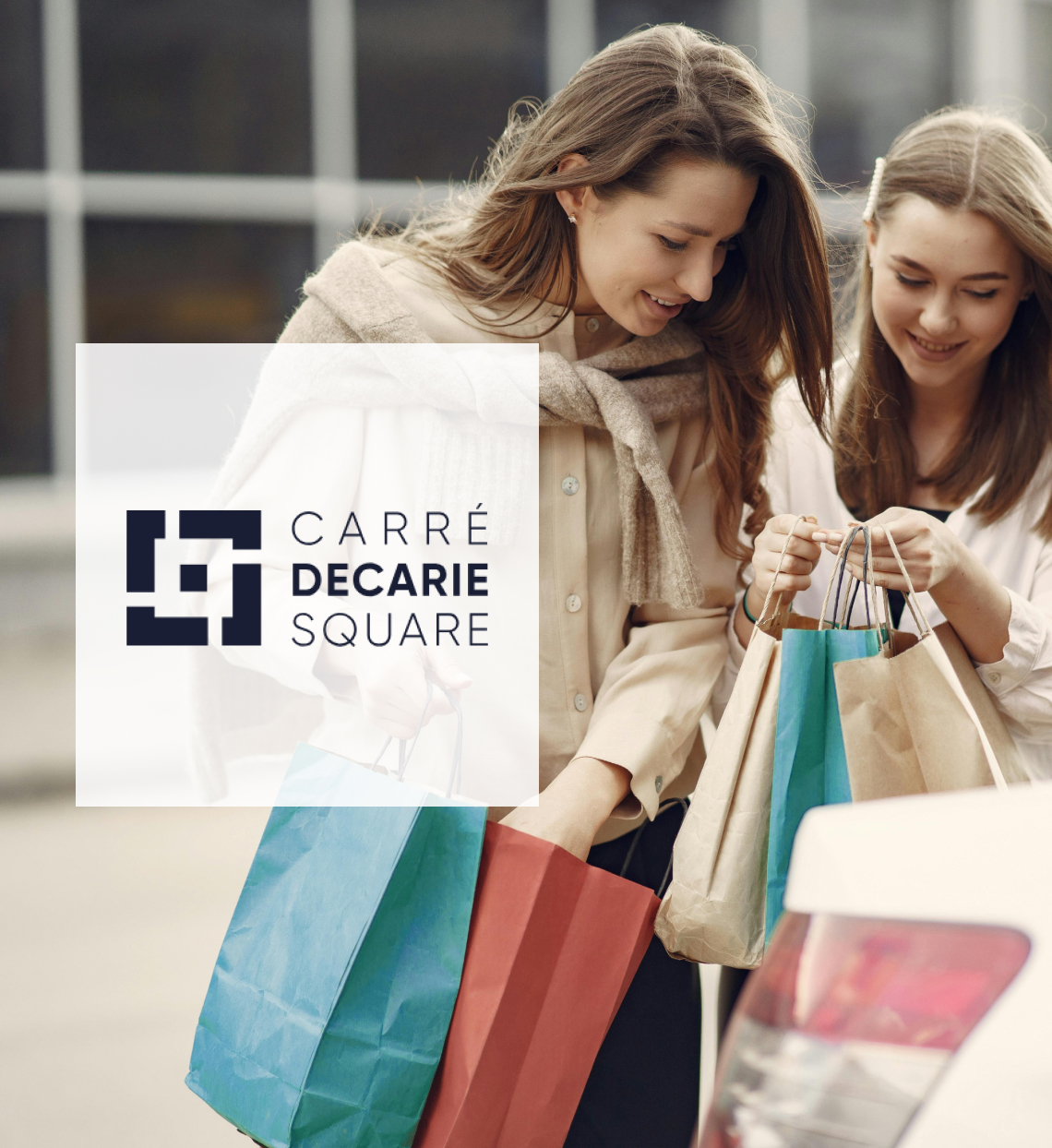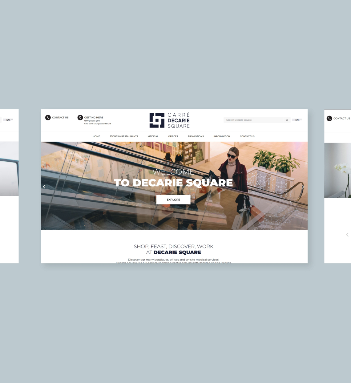 We designed a new logo for Decarie Square, incorporating a square shape to represent the “square” while also conveying movement to reflect the shopping center’s dynamic atmosphere. The website was redesigned to offer a fresh, modern look, featuring a 3D map integration with a seamless search function and an overview of the floorplan, allowing visitors to easily find what they are looking for.