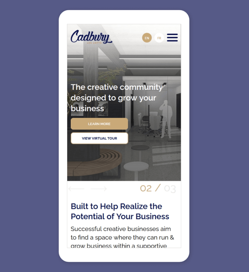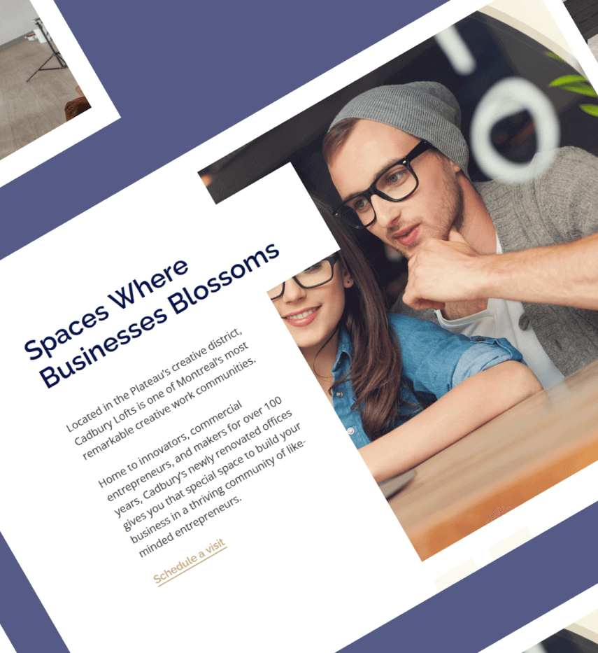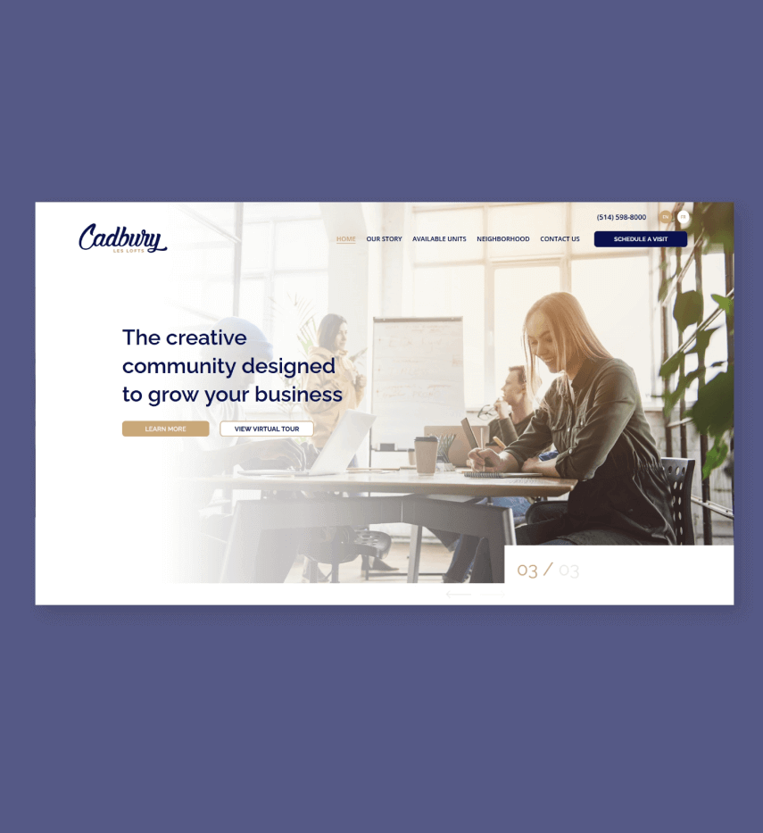 Les Lofts Cadbury were looking for a new fresh and creative design that matches the creativity they offer to their tenants. We designed a user-friendly, modern website that stands out amongst its competitors. We helped Les Lofts Cadbury with their content strategy to guide them to sending the right message about their unique offering to all their website visitors. To give them maximum flexibility to modify their website content, we custom designed the website in WordPress. This allows them to easily independently manage all of their available units and allows for potential tenants to schedule visits with the click of a button.