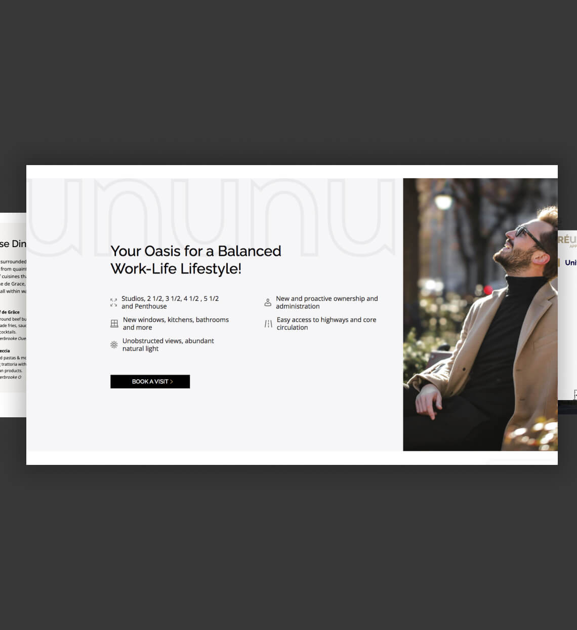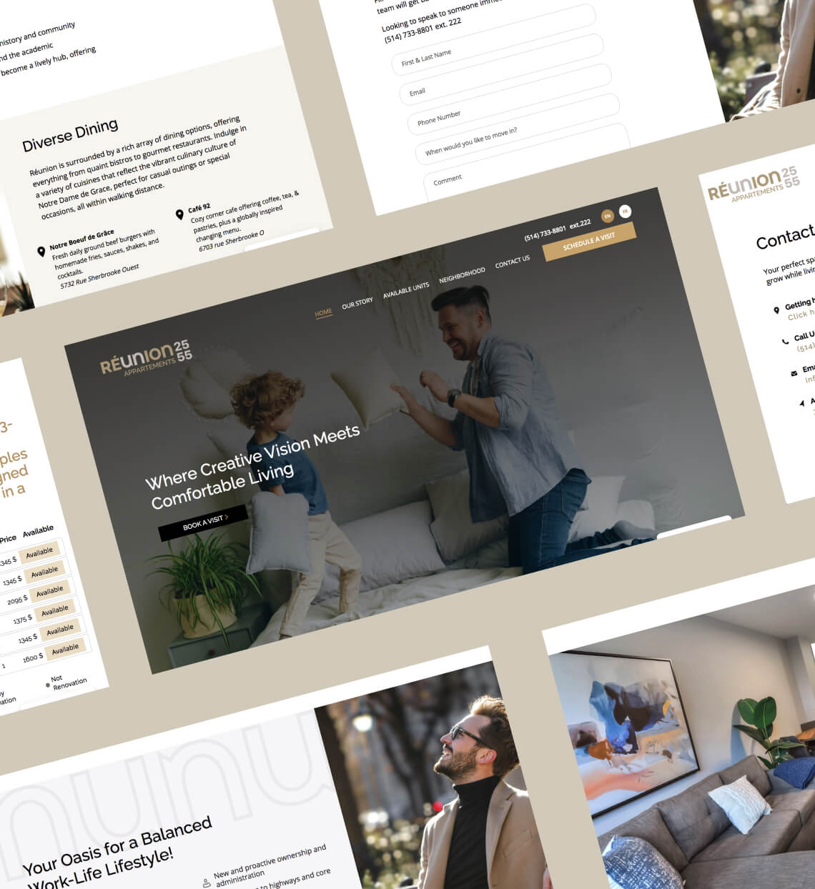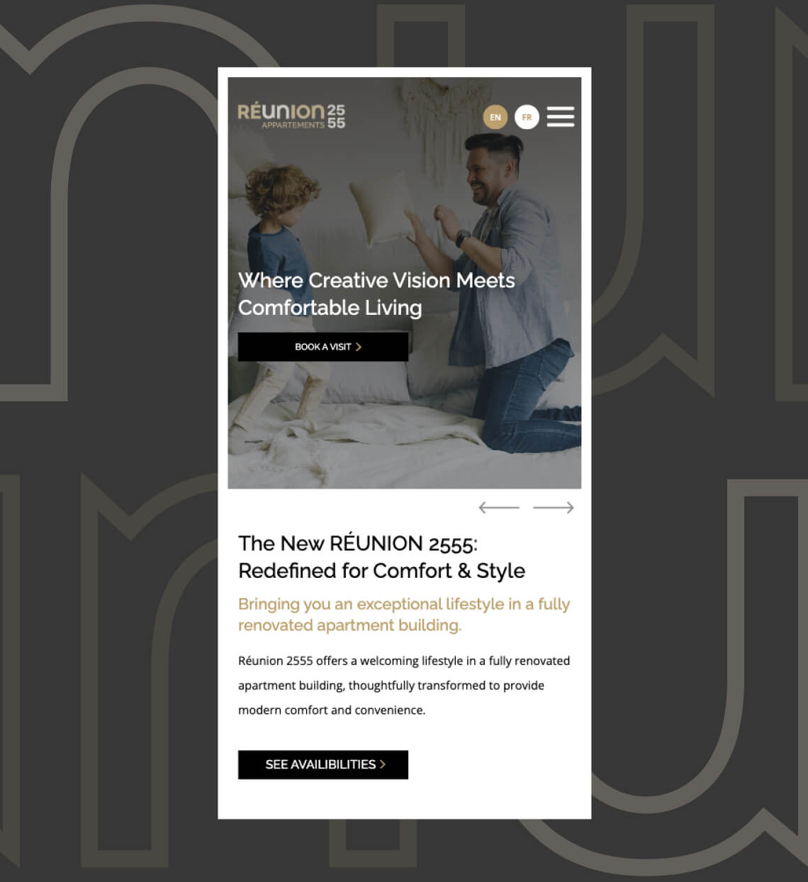 Reunion 2555, located in the heart of NDG in Montreal, has been thoughtfully redeveloped into a modern apartment complex, offering contemporary living in a newly renovated space. To support this transformation, we partnered with IDX Design Communication to create a sleek, modern website that reflects the building’s refreshed identity.